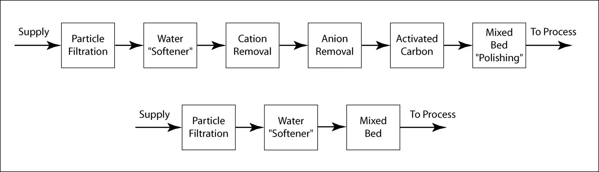 Yukarıdaki akış şeması, tipik bir deiyonize su üretim sürecinin adımlarını özetlemektedir: suyun tesis beslemesinden alınması, partikül filtrasyonu, yumuşatma, katyon ve anyon değişim yataklarından geçiş, aktive karbon ile organik giderimi ve son olarak karışık yataklı “polishing” bölümü. Daha küçük debiler için tek karışık yatak yeterliyken, büyük hacimli uygulamalarda çoklu tank sistemleri tercih edilir.