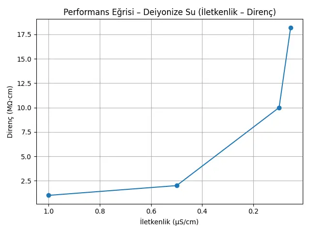 Bu sistemlerin performansı, iletkenlik ve direnç gibi parametrelerle değerlendirilir. Tipik olarak deiyonize edilmiş suyun iletkenliği 0,055 µS/cm veya daha düşüktür ve buna karşılık gelen direnç değeri 18,2 MΩ·cm seviyesine ulaşır .oplam organik karbon (TOC) değeri 10 ppb’nin altında tutulur ve UV sterilizasyon sayesinde mikroorganizma yükü minimize edilir. Aşağıdaki grafik, iletkenlik düşerken direnç değerinin nasıl arttığını gösterir. Bu eğri, yüksek saflık seviyelerine ulaşmak için sistem tasarımında girilen sudaki iletkenlik değerinin ne kadar kritik olduğunu vurgular.